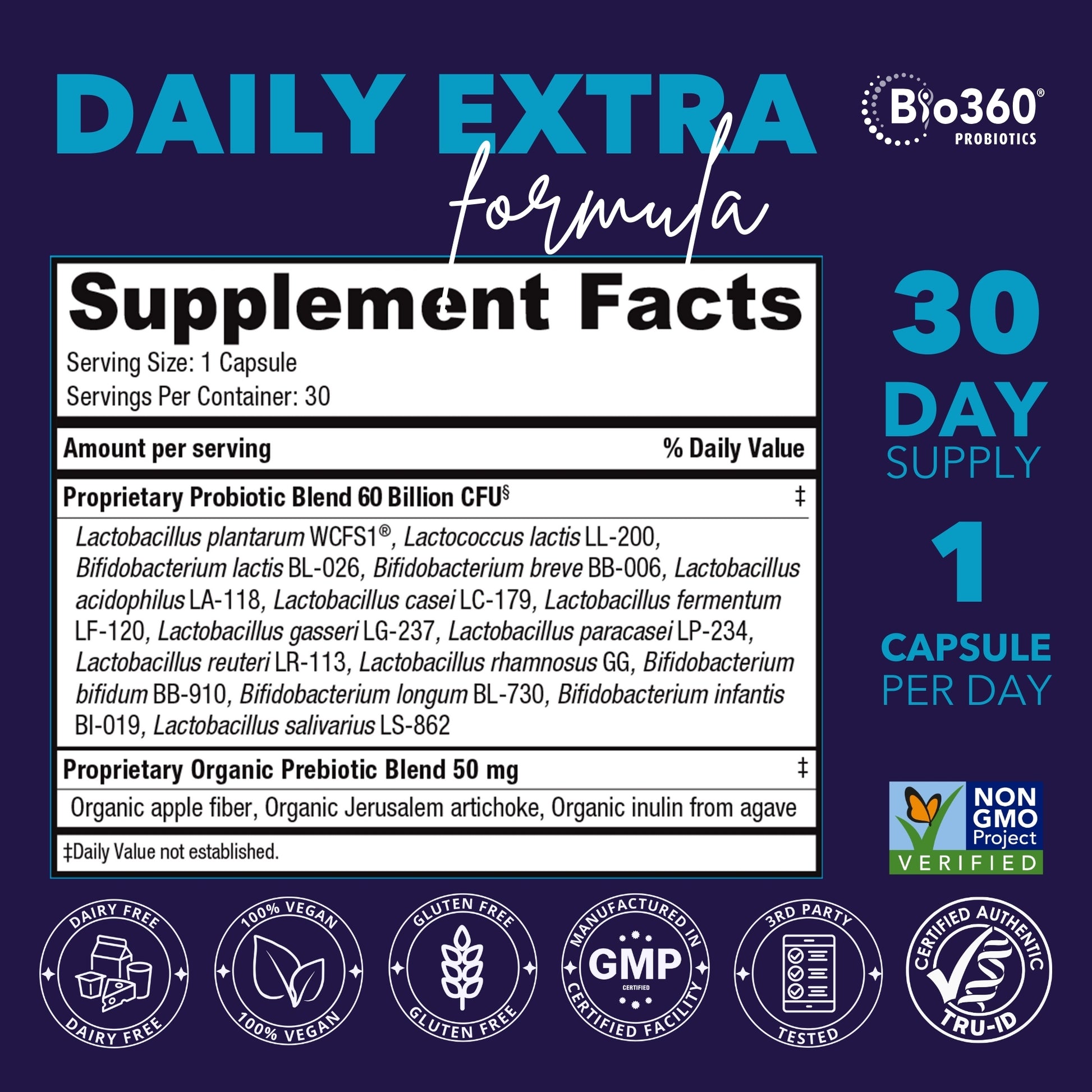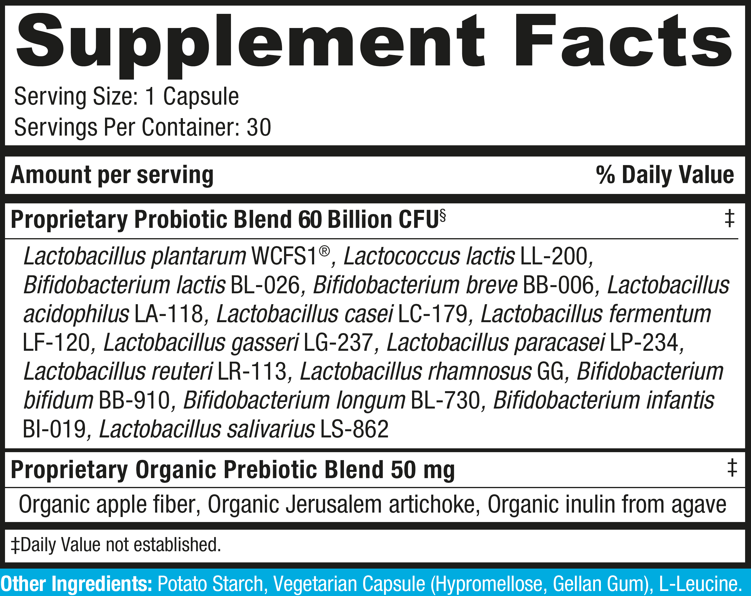 Bio360® is formulated with 15 research-backed probiotic strains, shown in clinical studies to support digestive health, improve gut flora balance, and strengthen immune function. Each capsule delivers a powerful dose of 60 billion live cultures to help repopulate and maintain healthy bacteria levels in your gut—especially beneficial after stress, a poor diet, or antibiotic use. Our formula combines prebiotic fibers with probiotics to create a synbiotic effect. Prebiotics feed the good bacteria, helping them thrive and multiply in your digestive tract for better, longer-lasting results. Up to 70% of the immune system resides in the gut. By restoring your microbiome, Bio360® supports your natural defenses, helping your body fight off pathogens and stay in balance. Our delayed-release mechanism protects probiotics from harsh stomach acid, ensuring they reach your intestines alive.